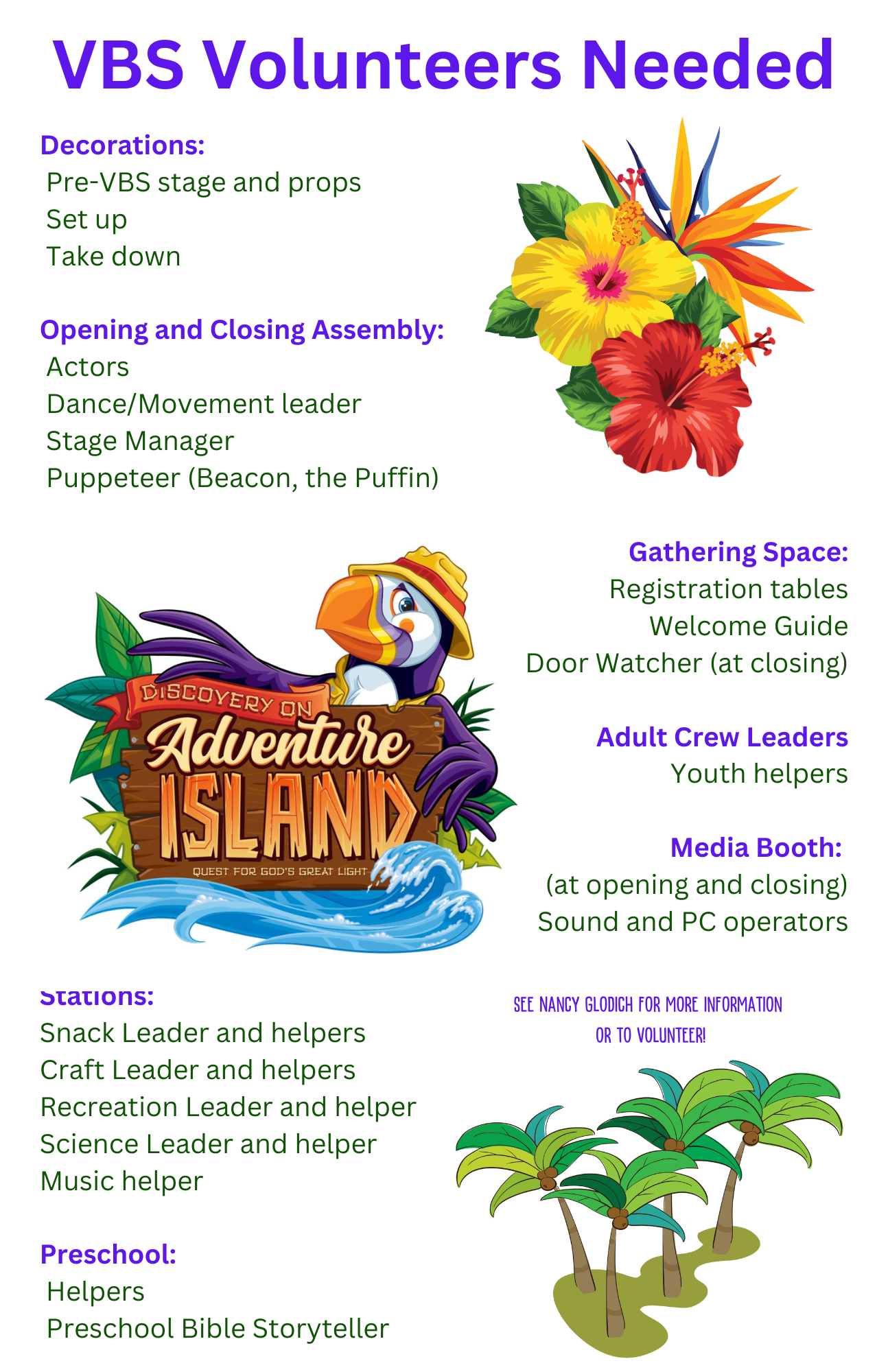 This year we’ll be having four sessions: Monday through Thursday June 22– 25. We are planning fun and faith-filled activities, and we need lots of volunteers to make it all happen! Whether you can work all 4 sessions or just one, we have lots of positions to fill and we need you!  Volunteers are asked to be there from 8:30 to 12:15.